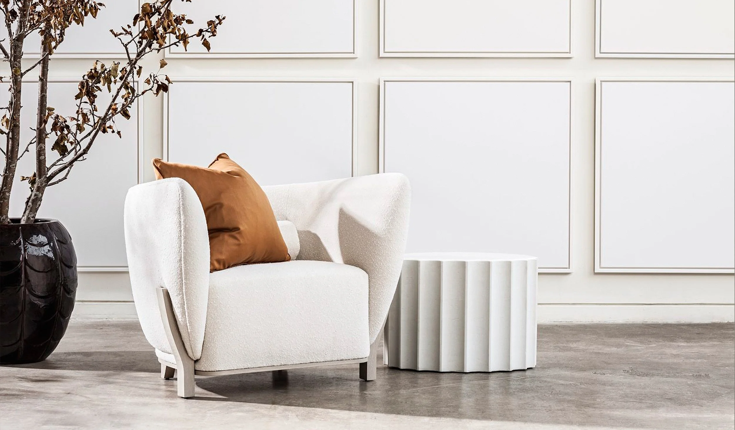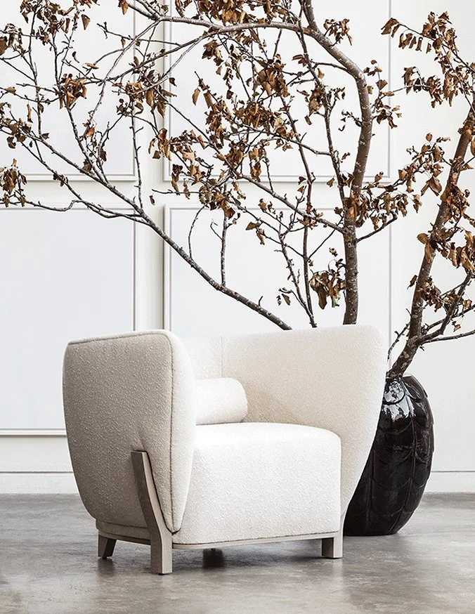 Inspired by the organic taper of a rosemary sprig; the Botero Lounge Chair interprets this natural element into a striking leg detail that clasps the curved back to a plush base. Textural bouclé enhances the enveloping contemporary form.