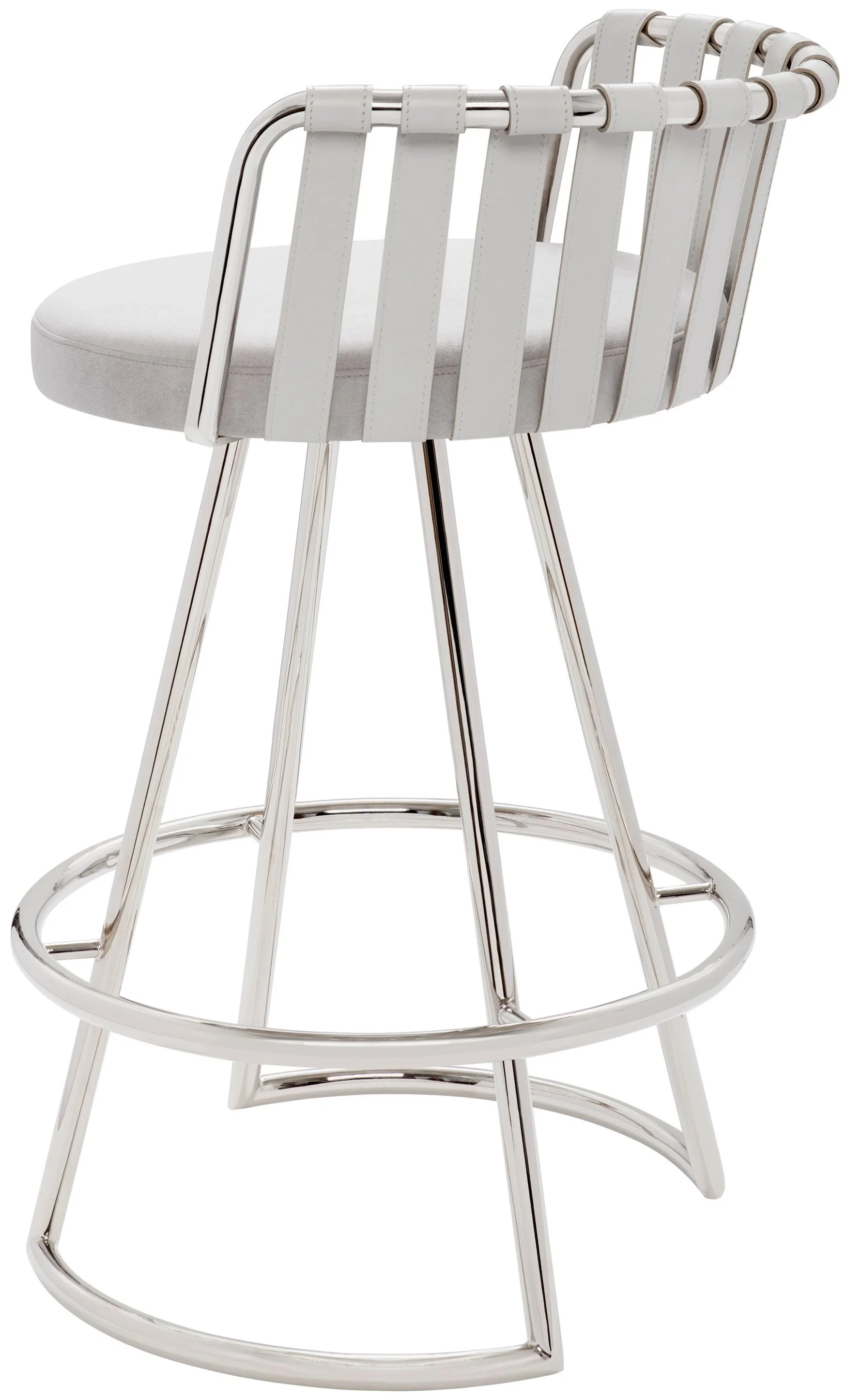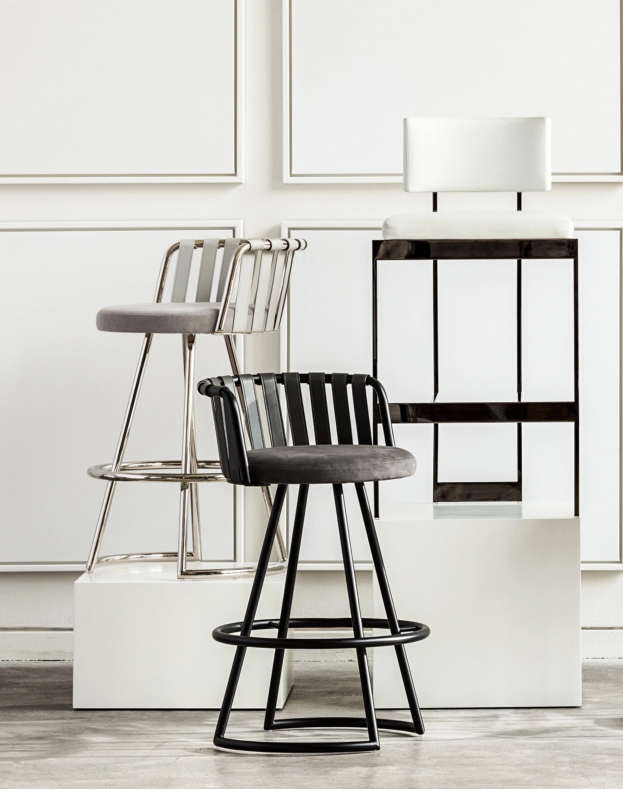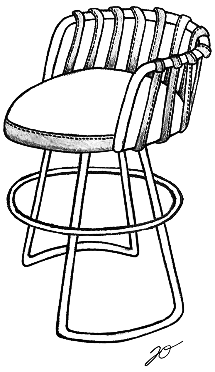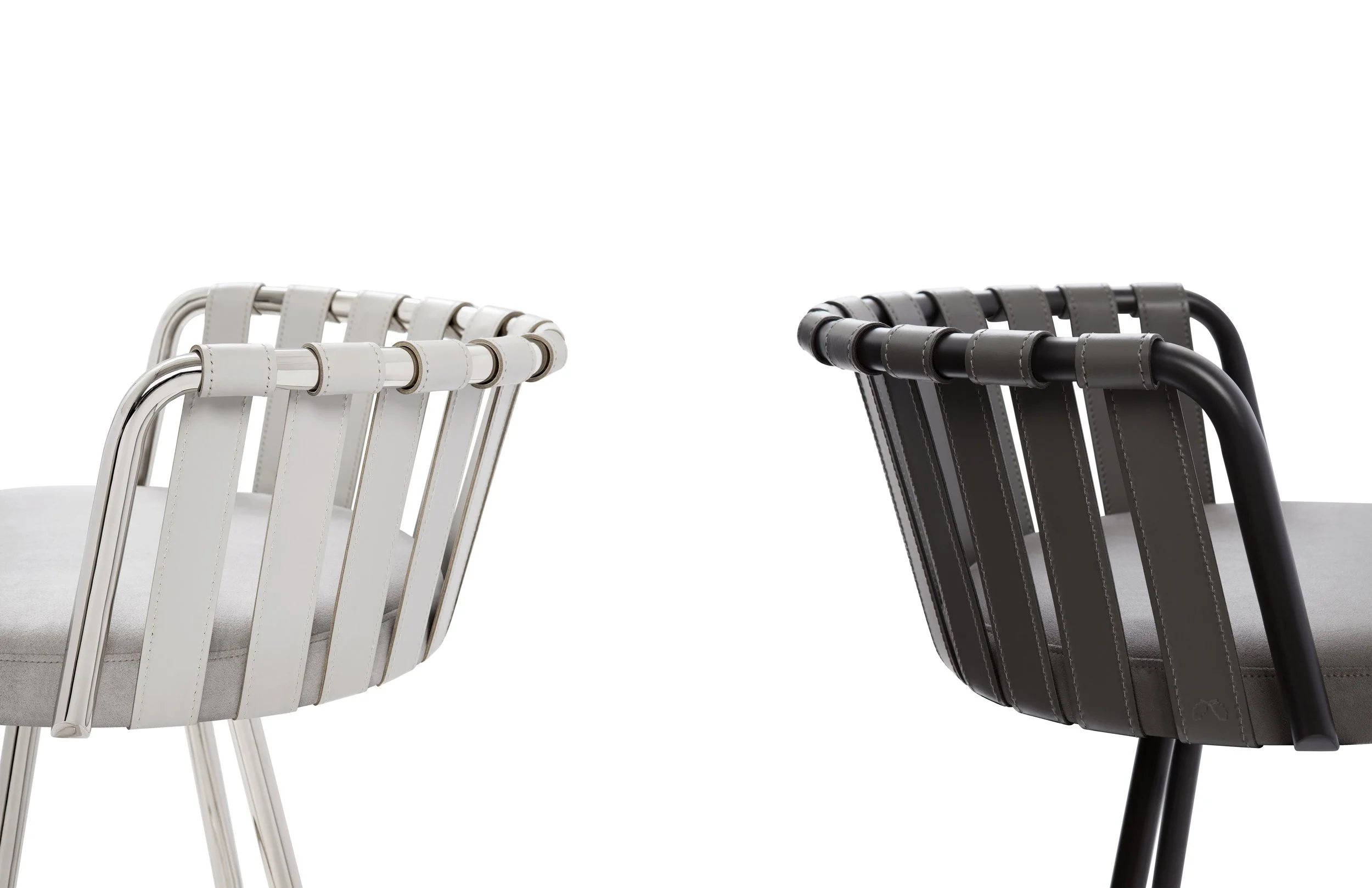 Belting leather straps are skived, and invisibly fastened to the sloped backrest, following the angle seamlessly. The piece also features an invisible return swivel mechanism.