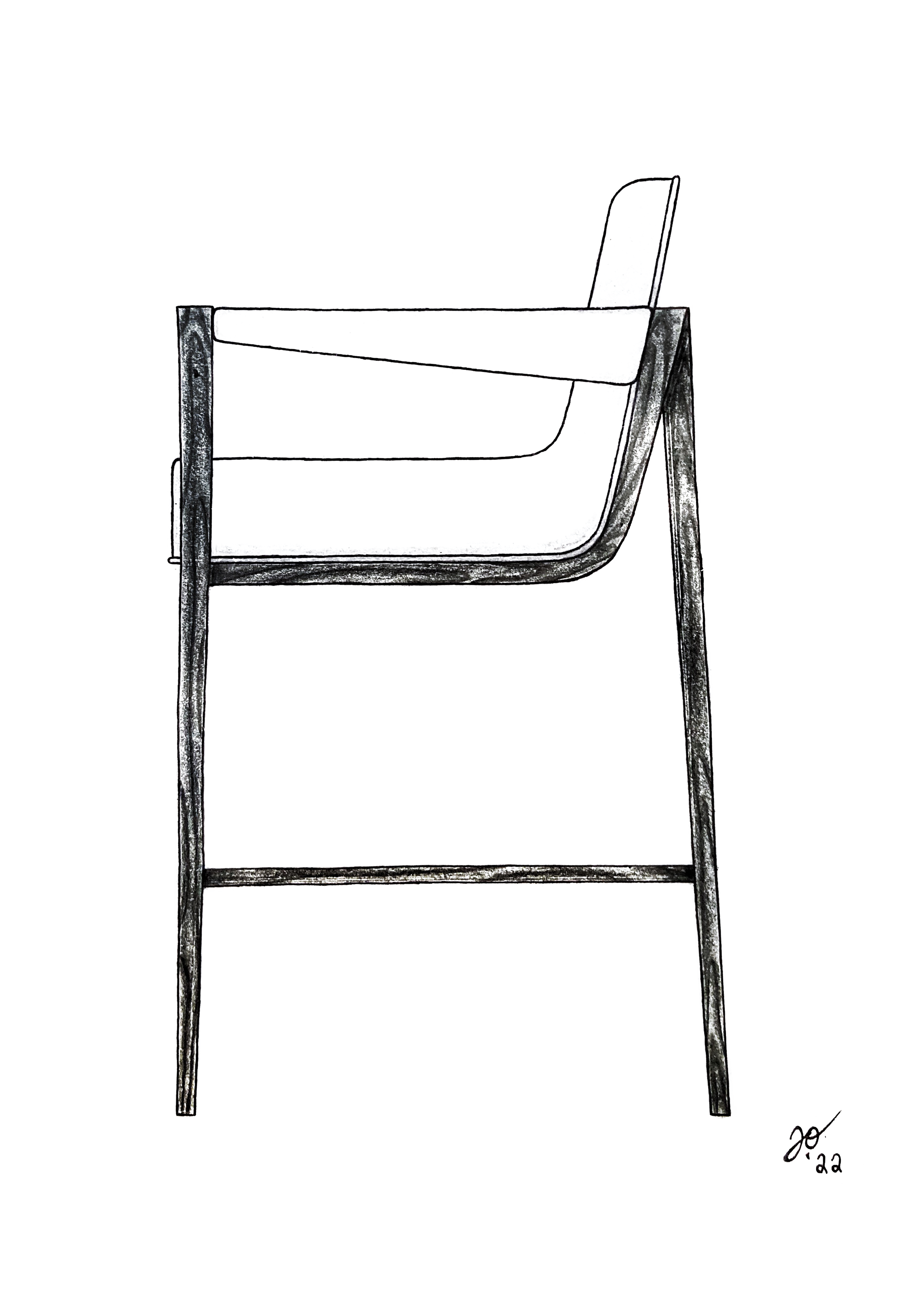 Strut’s angled back leg leads the eye up to the piece’s immediately recognizable compression-set upholstered arm. Where the arm terminates at the back, waterfall woodgrain sweeps back to its origin.